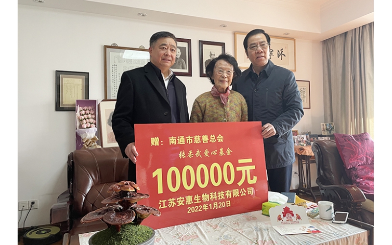 2022年1月20日,安惠公司董事長陳惠、南通市慈善總會副會長葉沈良來到張柔武老人家中,通過安惠健康公益基金向張柔武愛心基金捐贈10萬元,助力“情暖江海”春節(jié)慰問活動。