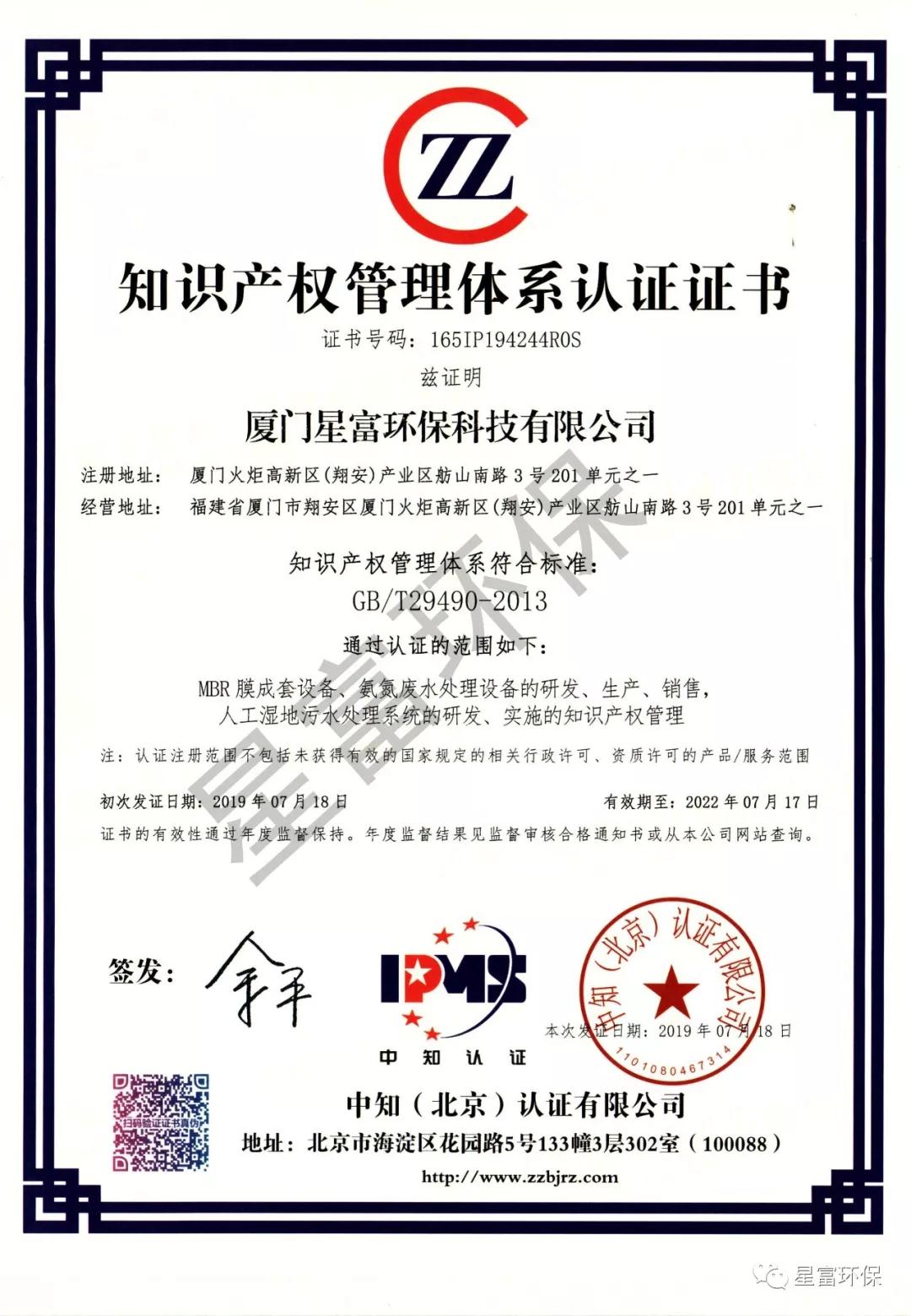 2019年07月18日,收到由中知(北京)認證有限公司頒發的《知識產權管理體系認證證書》,這意味著星富環保在知識產權領域獲得到重要認可,在知識產權方面得到進一步規范和在綜合競爭力得到進一步提升。